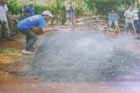 | Người dân xử lý rác thải từ sản xuất bằng cách đốt trong vườn. |
