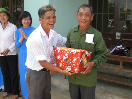 | Ông Hà Văn Thanh, Phó Bí thư Đảng ủy xã Ea Dăh trao quà chúc mừng gia đình cựu TNXP Đinh Xuân Danh |