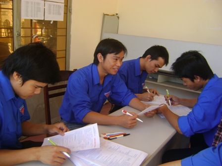 | Các bạn đoàn viên, thanh niên đang điền thông tin cá nhân vào phiếu đăng ký hiến máu |