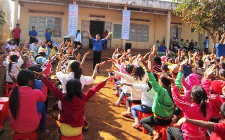 | ... và tổ chức các trò chơi tập thể cho hơn 200 em nhỏ có hoàn cảnh khó khăn tại buôn Dhía (xã Cư Né, huyện Krông Buk). |