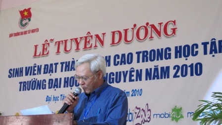 | Phó Hiêụ trưởng Trường Đại học Tây Nguyên, Nguyễn Tấn Vui phát biểu tại buổi tuyên dương |