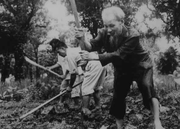 | Chủ tịch Hồ Chí Minh thăm bộ đội diễn tập, năm 1950. Ảnh: Tư liệu BTHCM |