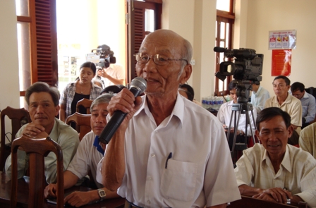 | Cử tri phường An Bình (thị xã Buôn Hồ) trình bày kiến nghị với ứng cử viên. Ảnh H.N |