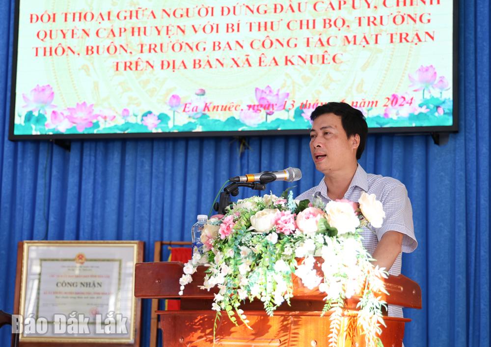 | Trưởng Ban Dân vận Huyện ủy Cư Kuin báo cáo tình hình thực hiện công tác kết nghĩa với buôn đồng bào dân tộc thiểu số. |