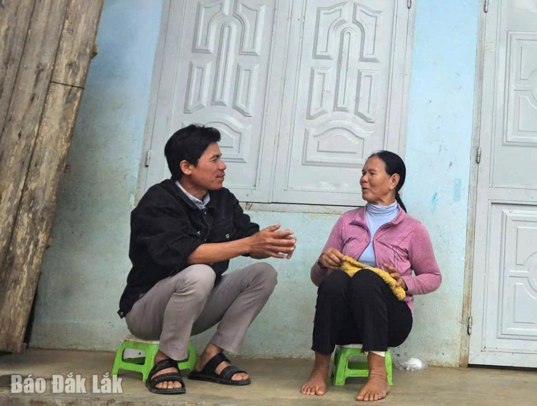 | Cán bộ Phòng Kinh tế xã Hòa Sơn tuyên truyền về ý nghĩa của chương trình xây dựng nông thôn mới cho người dân buôn Plum. |