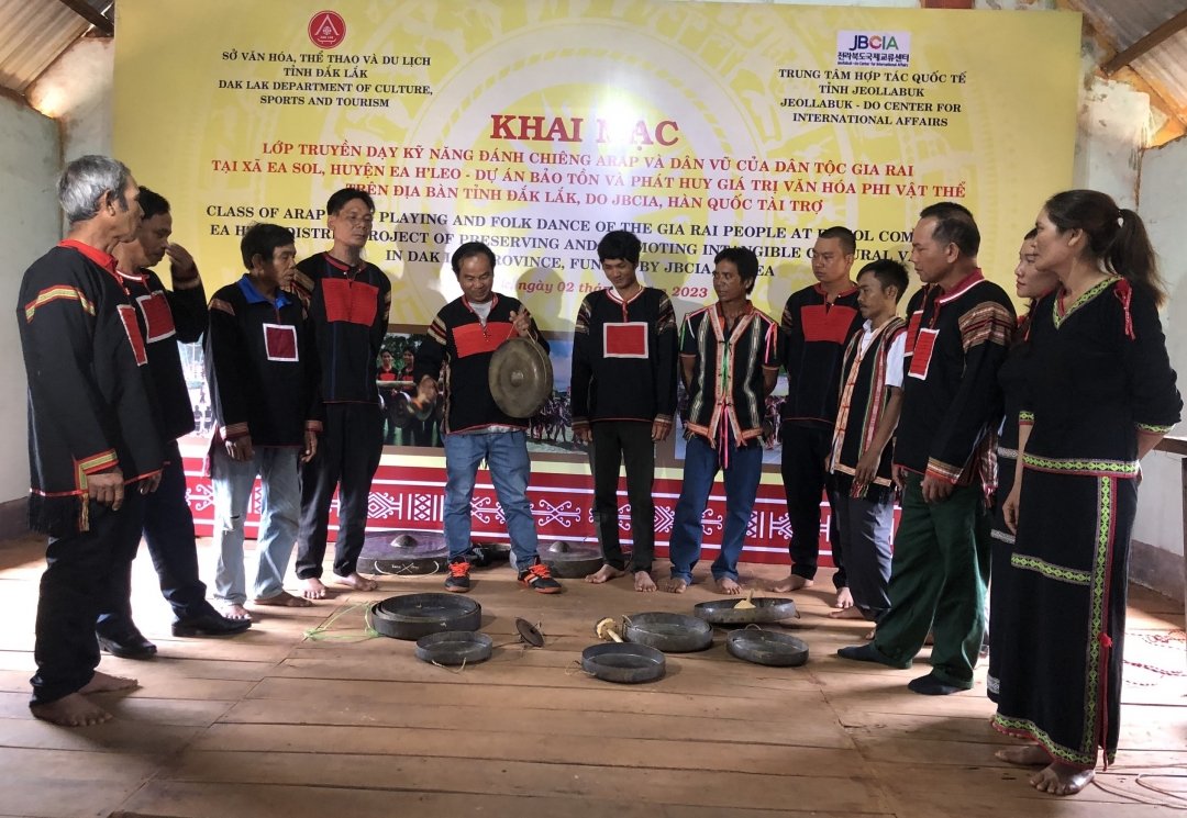 | Các nghệ nhân Bru - Vân Kiều ở xã Ea Hiu biểu diễn cồng chiêng và dân vũ. |