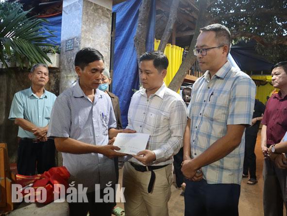 | Đại diện lãnh đạo Liên đoàn Lao động tỉnh tặng quà và lẵng hoa cho Công đoàn cơ sở Công ty TNHH May mặc Able Joy Đắk Lắk. |